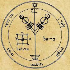 This pentacle is split by a magical sigil which resembles a tree bearing moons or coins. Above is the name IH (Iah) translating to “I am.” Below are the names of angels: and Bariel to the right of the sigil and and also on the left arranged around a quartered square, and Adoniel beneath that. It's versicle is Psalm 112:3: